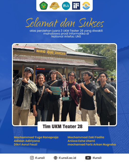 🎉 Selamat dan sukses kepada Mahasiswa Informatika Universitas Siliwangi. 🎉1. Mochammad Yuga Ranapraja (237006058)2. Adidan adiriyana (237006044)3. Dikri Asrul Fauzi (237006039)4. Muhammad Zaki Fadila (237006034)5. Anissa Esha utami (227006161)6. Mochamad Fariz Arkan Nugraha (247006111017)Kami sangat bangga dan mengucapkan selamat atas prestasi luar biasa yang diraih sebagai Juara 3 dari UKM Teater di “National Artefac UNS”Keberhasilan...Read More