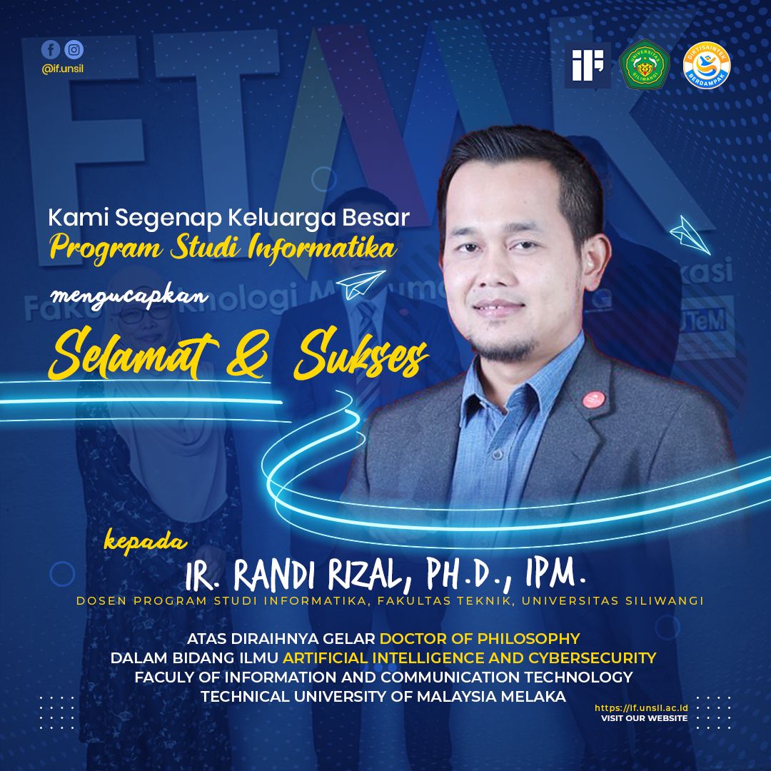 🎉 Selamat & Sukses 🎉 Kepada Ir. Randi Rizal, Ph.D., IPM. Dosen Program Studi Informatika Fakultas Teknik, Universitas Siliwangi Barakallahu fi ilmu wa fi ‘amalikum Atas diraihnya gelar Doctor of Philosophy dalam bidang Artificial Intelligence dan Cybersecurity di Faculty of Information and Communication Technology, Technical University of Malaysia Melaka Semoga ilmu yang telah diraih senantiasa...Read More